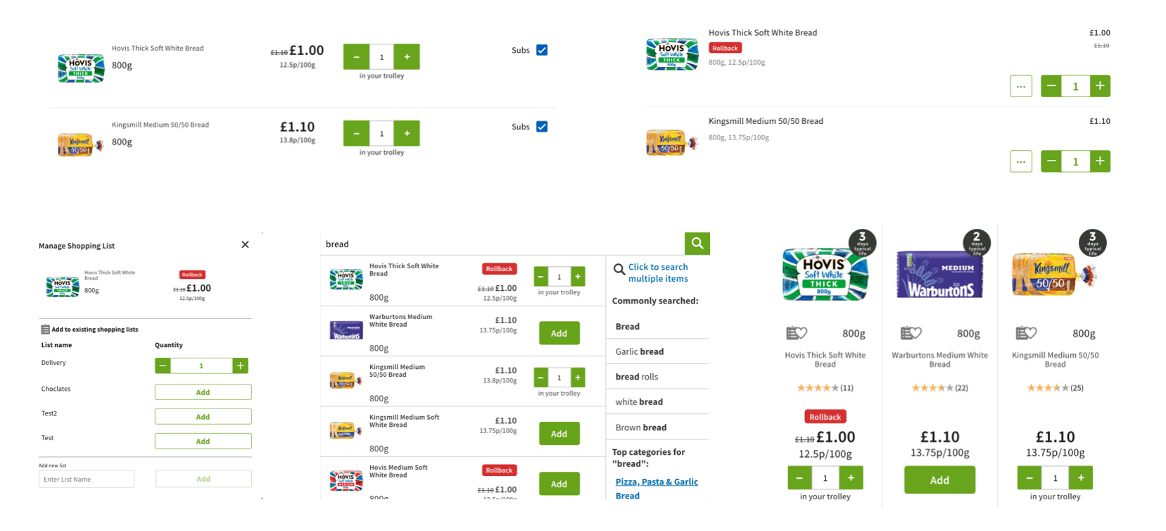 Screenshots displaying different variants of Add button live on Asda groceries