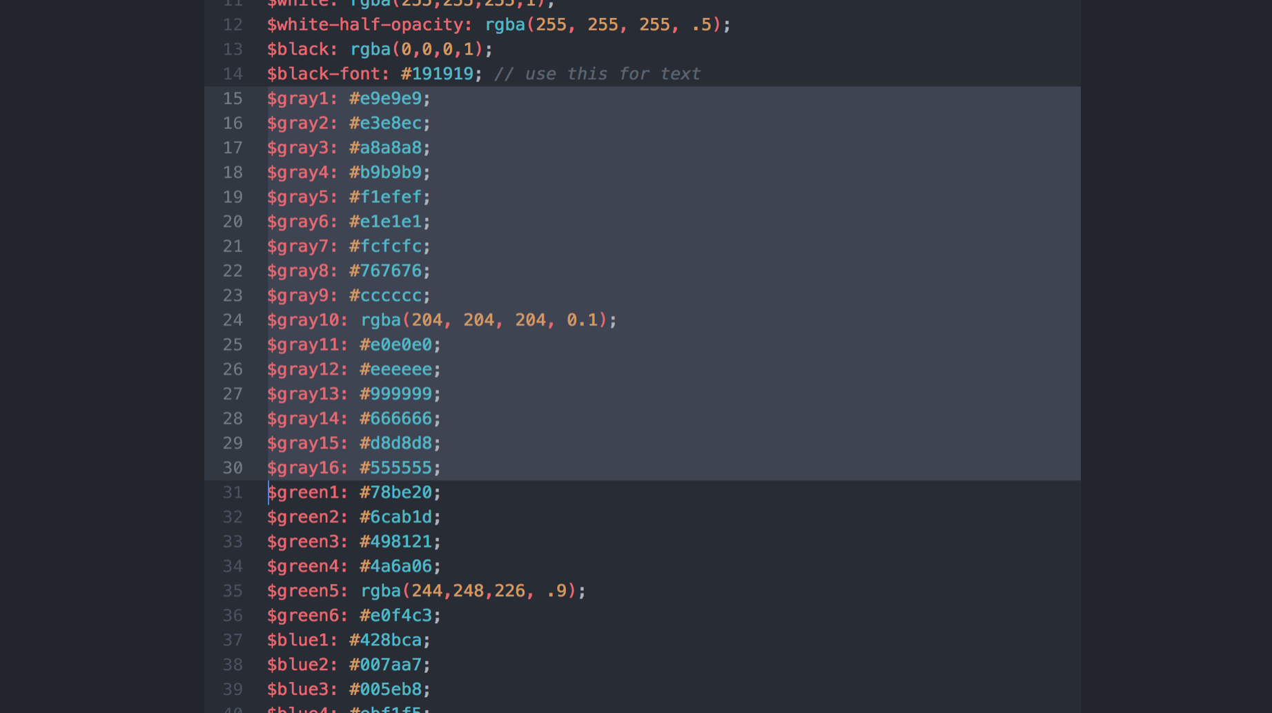 Screenshot from dev css code displaying 16 different types of gray's in use
